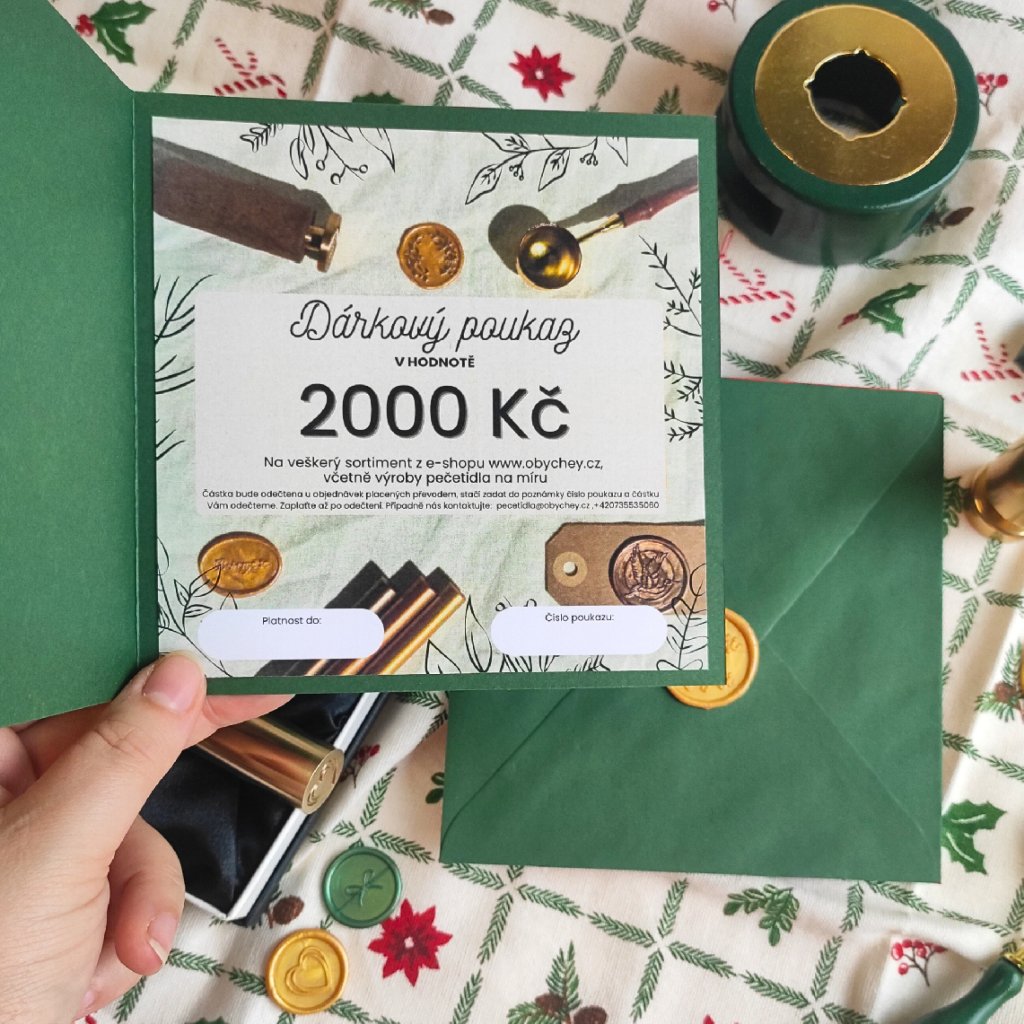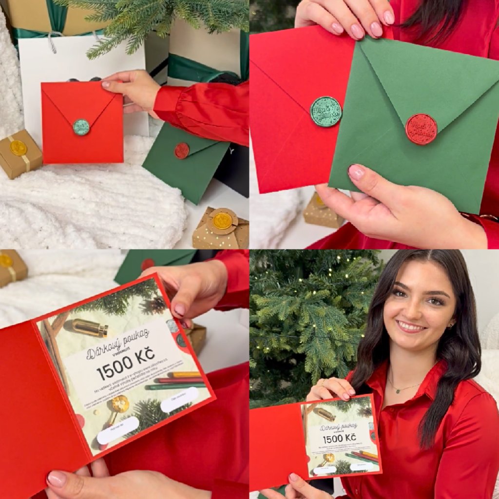 Napište mi do poznámky, zda jej chcete v zelené či červené obálce se zlatou pečetí, dovnitř pevné karty s poukazem můžete napsat vzkaz, zalepit hotovou pečetí a hned darovat.