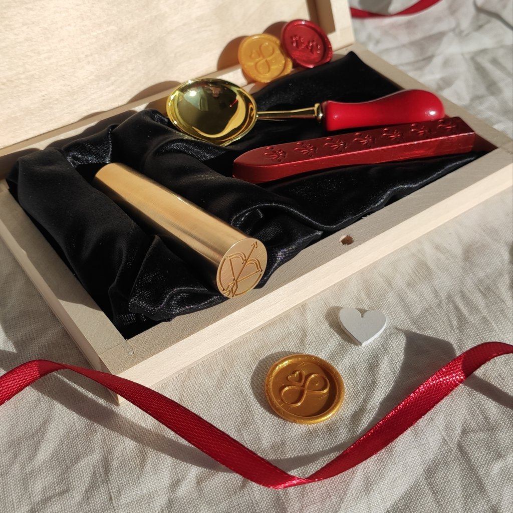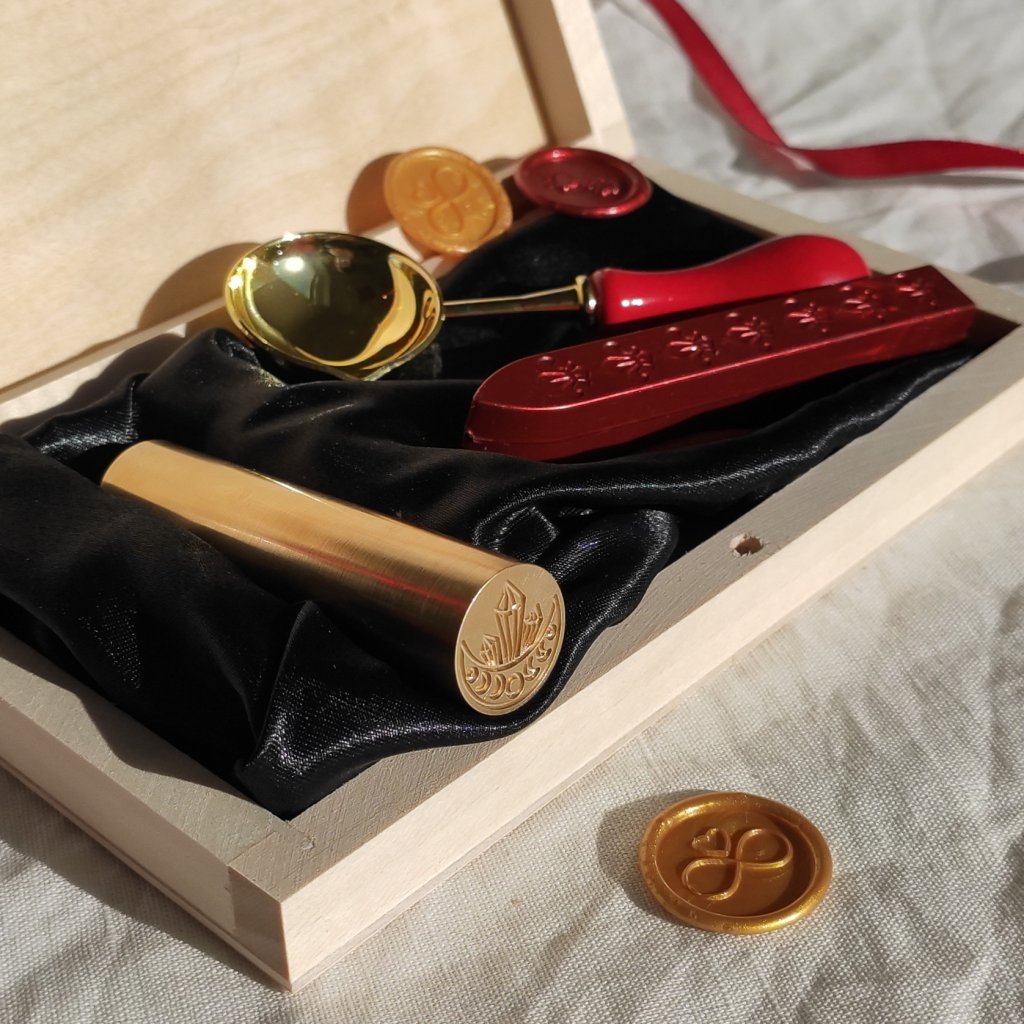 Pečetidlo je oboustranné se dvěma motivy dle výběru a v sadě najdete velkou červeno-zlatou pečetní lžíci a červený perleťový vosk.