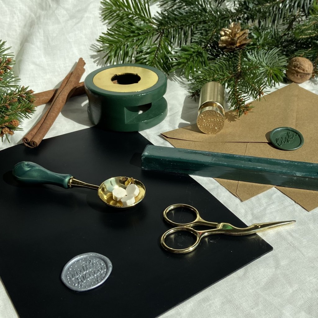 Stojánek na pečetní lžíci, bankovní vosk, obálku s přáním, velkou silikonovou podložku, a velkou pečetní lžíci. K tomu navíc nádherné zlaté nůžky! Ušetřete díky těmto limitovaným sadám.
